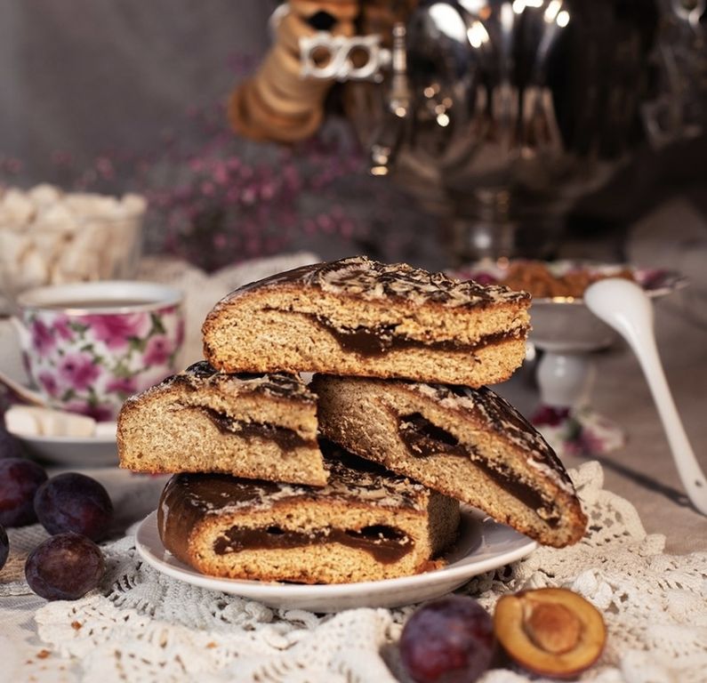 Состав: мука пшеничная хлебопекарная в\с, сахар песок, начинка (фруктовая или вареная сгущенка), мед натуральный, продукт яичный меланж, масло из коровьего молока сладко-сливочное, не соленое (крестьянское), маргарин для выпечки, вода питьевая, разрыхлители.